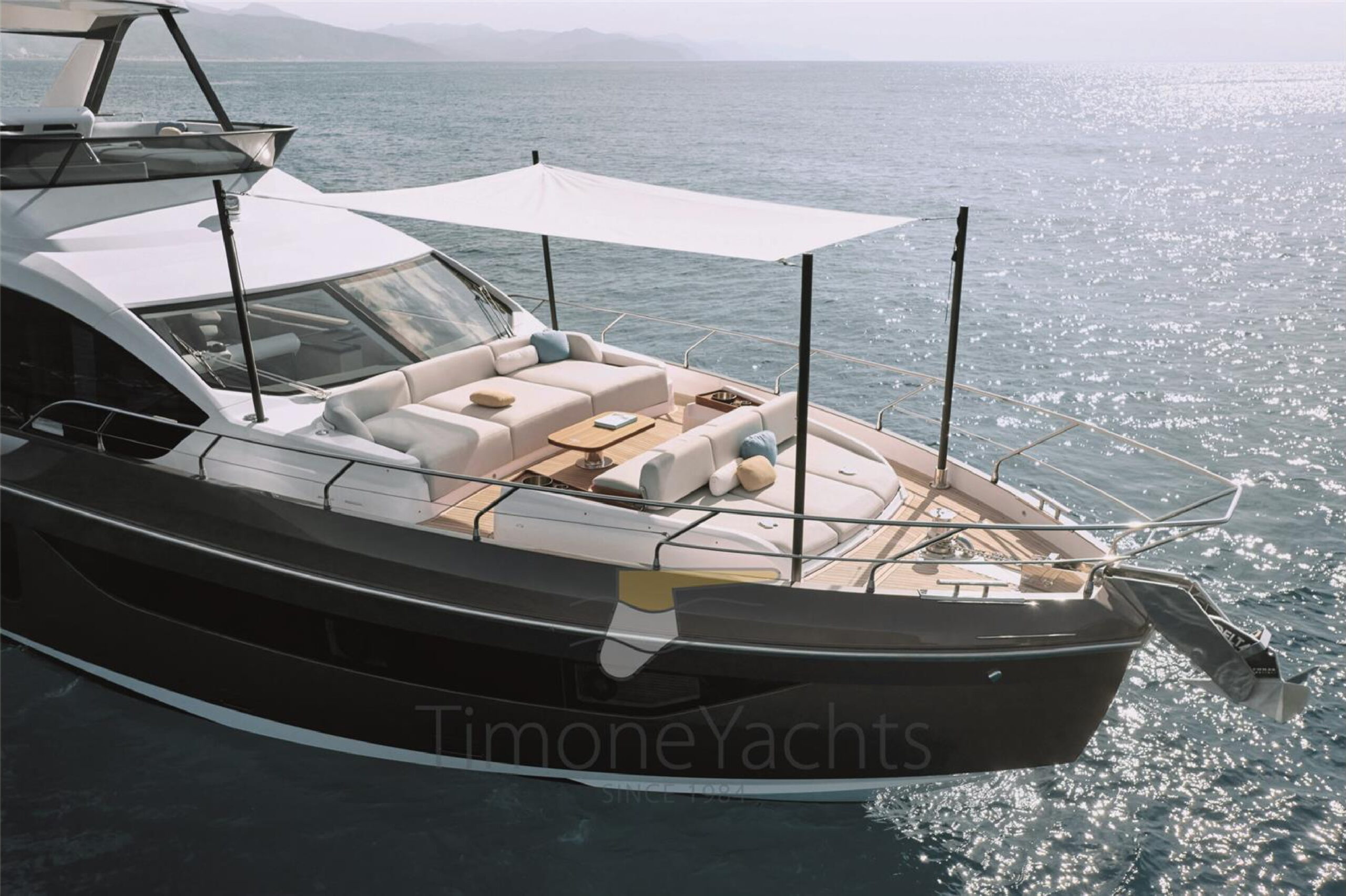fluid furniture in light brushed oak blends with natural textiles in neutral nuances and occasional mahogany accents, fully unfolding the harmonious essence of the Fly 68. The contemporary appeal of the Fly 68 is expressed through the possibility to choose among three main deck configurations, each imagined to suit unique onboard living styles and desires. From a more easy-going galley placed at the entrance to the more sensual solution of the semi-hidden “Lanterna” layout, the rest of the space is designed to adapt, ensuring that the midship main deck always hosts a multi-purpose lounging experience